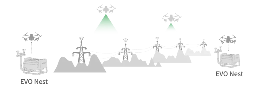 El EVO Nest se puede implementar fácilmente en el área de patrulla para despegue automático, aterrizaje preciso, almacenamiento y carga automática.