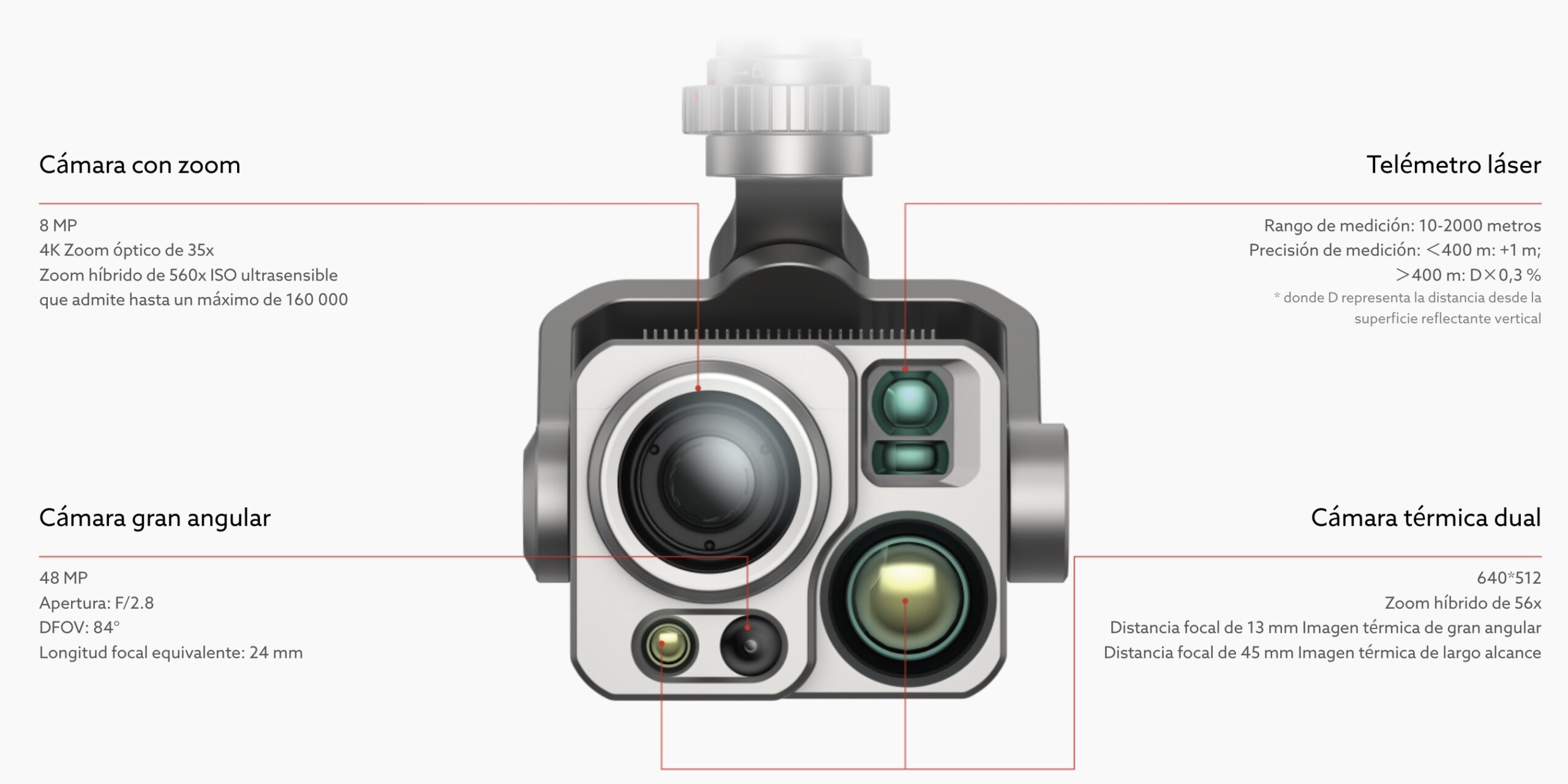 La cámara térmica admite un zoom híbrido de 56x y dos lentes termográficas, con una resolución de 640 x 512. Incorpora un lente gran angular de 13 mm y un teleobjetivo de 45 mm, lo que permite una visión general con distancias focales cortas y una visión detallada con distancias focales largas.