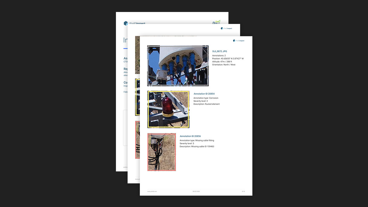 Ahorre tiempo con informes automáticos. PIX4Dinspect registra, compila y formatea anotaciones con información posicional a medida que avanza. Exporta tu informe profesional con solo un clic.