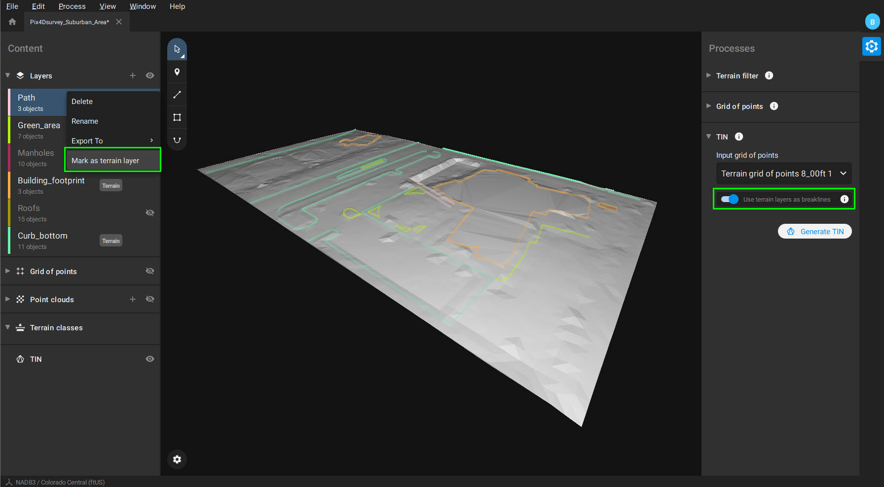 Genere un TIN para modelar el suelo y cree archivos vectoriales CAD listos para ingeniería a partir de datos de nubes de puntos extrayendo elementos clave de su proyecto con PIX4Dsurvey.